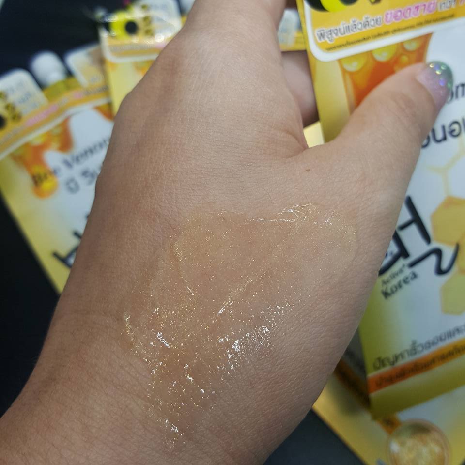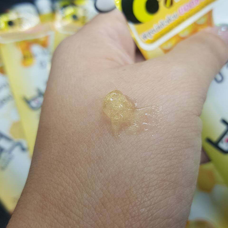 เนื้อเป็นครีมเจล ผสมทองคำวิ้งๆ ใสบางเบา ซึมแล้วตึงทันที และกลิ่นหอมอ่อนๆเหมือนกลิ่นน้ำผึ้ง